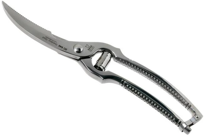 This pair of Due Cigni poultry scissors is stronger than household scissors. Not surprising because, as the name already suggests, this pair is meant to cut poultry into pieces. Chicken bones, for instance, are no problem at all. The spring in these scissors prevents you from slipping. Very safe. After all when you cut game you sometimes have to apply some pressure. The scissors are made from stainless steel and enhanced with a clip to safely store the pair.