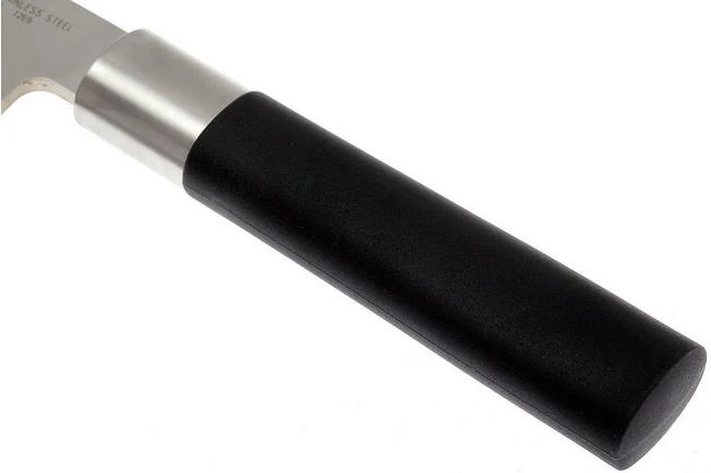 Kai is known for their high quality Kai Shun kitchen knives. The Kai Wasabi series is also gives great quality, but is a bit more affordable. The Daido 1K6 stainless steel blade is sharpened thin to a hardness of 58 HRC. Because these knives don’t have a bolster the whole edge can be used and the entire length can be sharpened. The handle is made out of a combination of bamboo powder and polypropylene. This makes it durable and waterproof.