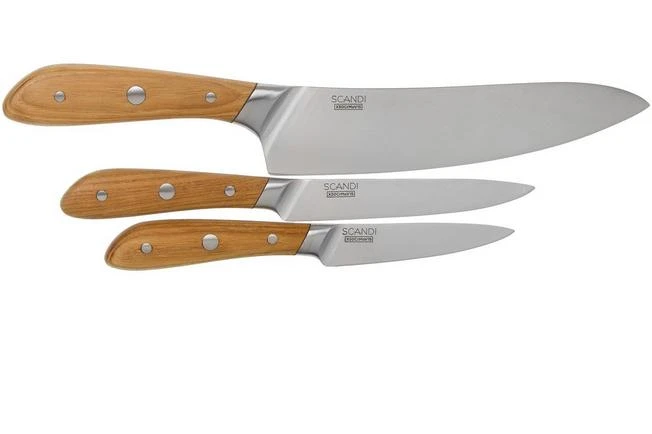 This Richardson Sheffield Scandi knife set is comprised of a chef’s knife, paring knife and utility knife. These knives are, in general, the ones that are used most in the kitchen. As such it is a great set when you are looking for top-quality knives for a great price.