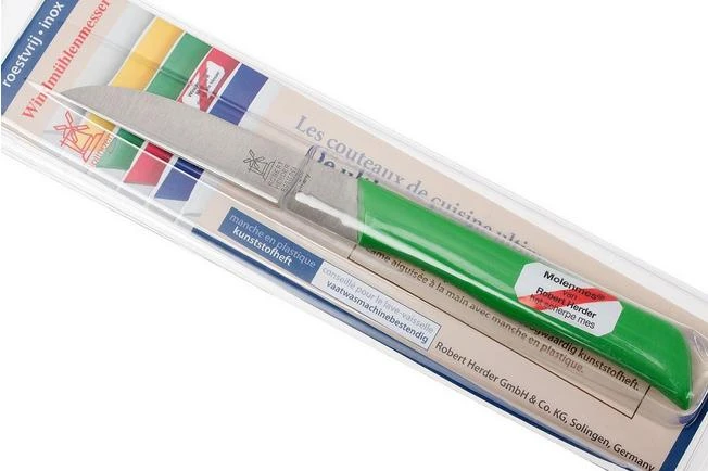 The Robert Herder green straight classic 1966 peeling knife follows in the footsteps of Robert Herder’s famous mill knives. This peeling knife is ideal for peeling fruit and vegetables. You can also use it to cut fish and meat. The polypropylene plastic handle offers excellent grip. The pure stainless steel blade is sharpened by hand according to the traditional German “Solinger Dünnschliff” principle. The result is a razor-sharp knife.