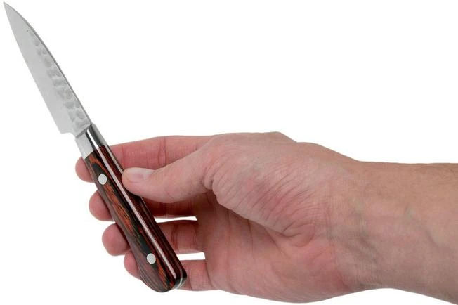 This Sakai Takayuki petty from the 33-layer Damascus collection is, with its 8 cm long blade, comparable to the western peeling knife. Perfect for the more detailed cutting and peeling tasks.