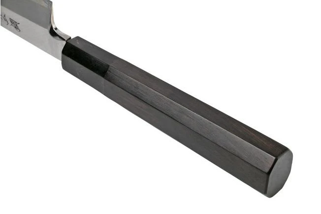 The Sakai Takayuki Blue 2 Steel Japanese Style 01204 yanagiba is a single-sided grind kitchen knife for cutting slices of meat, fish or vegetables. The 27 cm long blade allows you to make one long cutting movement per slice. This enables you to cut extremely thin slices of meat, fish or vegetables. Ideal for sushi or sashimi!