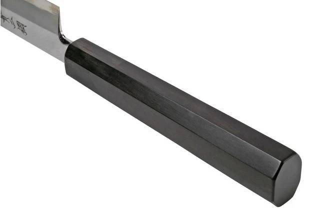 The Sakai Takayuki Blue 2 Steel Japanese Style 01214 fuguhiki is a Japanese kitchen knife originally designed for cutting fugu, the Asian dish made from the highly poisonous puffer fish. This fish must be filleted very carefully to remove the poisonous parts of the fish without contaminating the rest. Chefs must undergo special training before they can serve the dish. And of course, you only use the very narrow fuguhiki knife for the preparation!