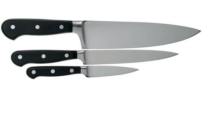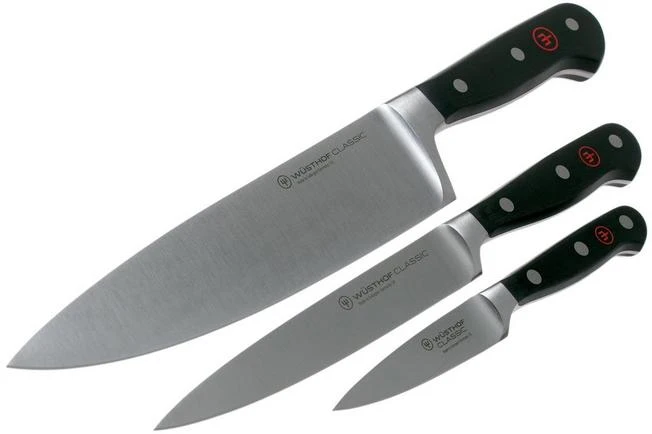 This Wüsthof Classic 3-piece knife set offers three versatile kitchen knives for the large, medium-sized and small tasks in the kitchen.