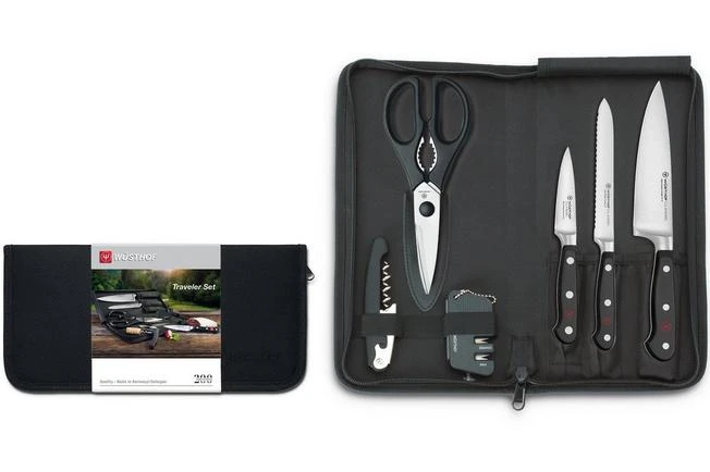 With the 6-piece Wüsthof Classic traveler set you can even benefit from Wüsthof’s amazing top-quality products while spending time on the road. The set is comprised of a chef’s knife, bread knife, paring knife, scissors with nut cracker, corkscrew and pull-through sharpener. All nicely stored in a case with zipper. Great when you spend time on the campsite.