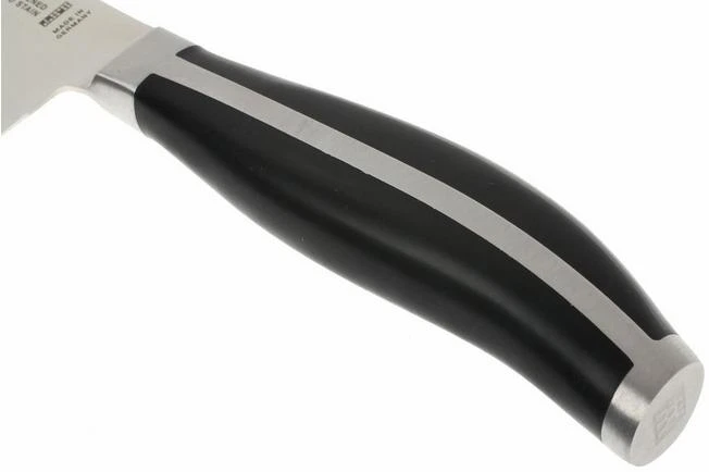 The Twin Cuisine knives have, like many other kitchen knives, a full tang blade: the blade runs entirely through the handle. In this award-winning design, the blade runs horizontally through the black plastic handle. Which is therefore very beautifully interrupted. That handle is seamless and attached to the blade without rivets. The handle feels very comfortable. The bolster of the blade provides a good balance and protects your index finger, which logically falls behind the curve and therefore will not accidentally slip and hit the edge.